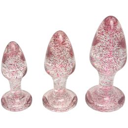 Nämä baseksin ihanat anustapit saavat silmäsi loistamaan kilpaa niiden sisällä kimmeltävän glitterin kanssa. Settiin sisältyy pieni, keskikokoinen ja iso tappi, joten se tarjoaa kaiken tarvittavan mukavan täyttäviin ja ihanan venyttäviin anaalileikkeihin.