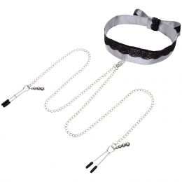 Hopeanhohtoinen satiinikaulapanta ja siihen kiinnittyvät nänninipistimet ovat täydellinen asuste aistillisiin bondage-leikkeihin kumppanin kanssa. Se on osa Fifty Shades of Grey -tuotemerkin Play Nice -tuotesarjaa.