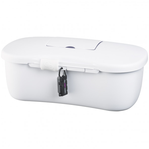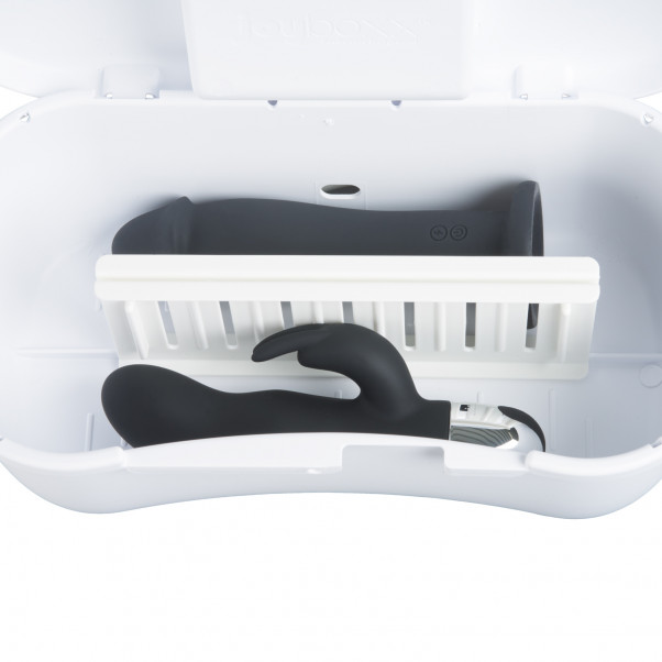 Laatikossa on yksi iso ja tilava lokero ja kannessa pienempi lokero esimerkiksi kondomeille tai bullet-vibraattorille. Sisäpuolella on myös kätevä ritilä, jossa vastapuhdistetut tuotteet pääsevät kuivumaan. USB-johdolle tarkoitetun aukon kautta voit ladata suosikkilelusi huomiota herättämättä.