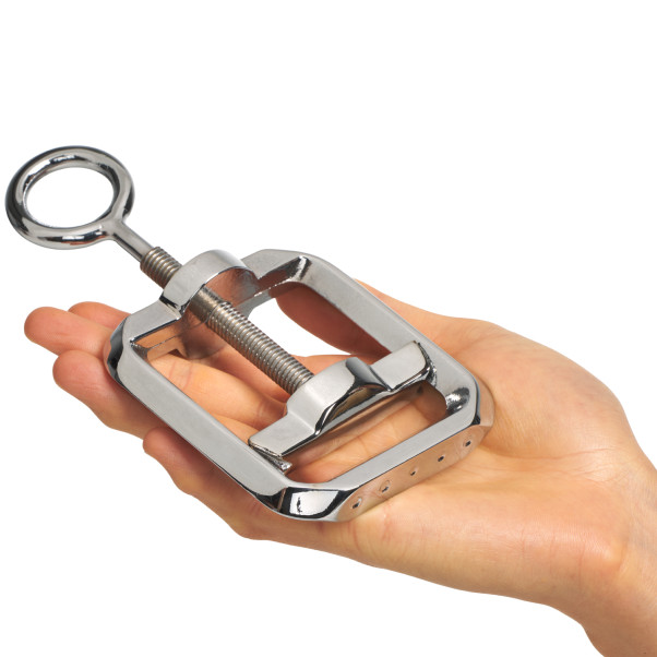 Puristin on täydellinen työkalu tottelemattoman kumppanin rankaisemiseen. Avaa puristimen suu ruuvilla, aseta kivekset aukkoon ja kiristä haluamallasi tavalla. Jos kaipaat vieläkin kinkympää elämystä, voit kiinnittää ruuvin päässä olevaan metallirenkaaseen painoja ja muita eroottisia tarvikkeita. Kivikova ruostumaton teräs ja ruuvimekaniikka tekevät tästä intensiivisestä puristimesta parhaan valinnan kokeneille BDSM-harrastajille.