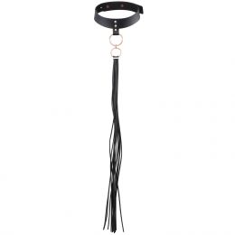 Choker-mallisessa kaulapannassa on kiinni kullanväriset metallirenkaat, joista roikkuu piiskamaiset siimat. Kaulapannan muotoilu vie ajatukset välittömästi Fifty Shades -tyyppiseen bondage-maailmaan, mutta on samalla niin tyylikäs, että tätä voi hyvin pitää koristeena julkisella paikallakin.