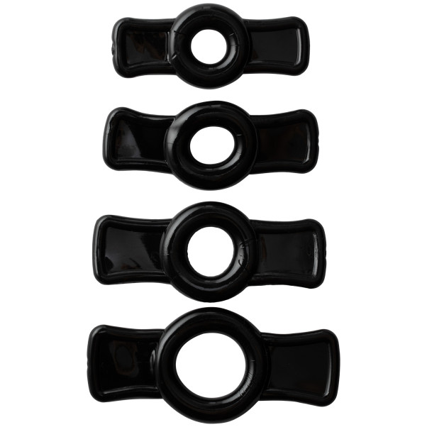 Käytännöllinen TitanMen Penisrengassetti sisältää neljä erikokoista penisrengasta, joissa on siivekkeet päällepukemisen helpottamiseksi. Setti on hyvä valinta mikäli olet epävarma sinulle parhaiten sopivan penisrenkaan koosta tai nautit erityyppisestä puristuksesta peniksellä.