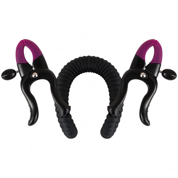 Voit säätää violettien silikonipuristimien tiukkuutta ruuveilla tarpeen mukaan. Puhdista levitin lämpimällä vedellä ja miedolla saippualla tai seksilelun puhdistusaineella käytön jälkeen.